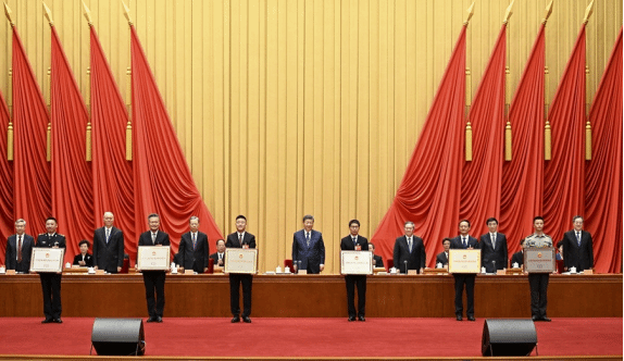 在欢快的乐曲声中,习近平等为受表彰的模范个人和模范集体代表颁奖。