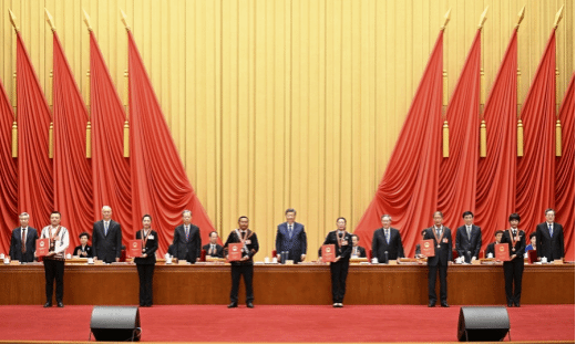 李强主持大会,王沪宁宣读表彰决定,赵乐际、蔡奇、丁薛祥、李希出席。
