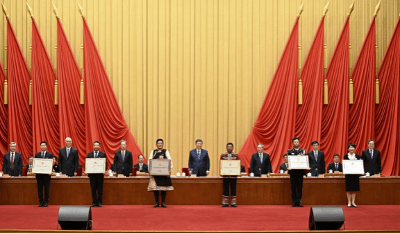 9月27日,全国民族团结进步表彰大会在北京举行。这是习近平等为受表彰的模范个人和模范集体代表颁奖。新华社记者 鞠鹏 摄