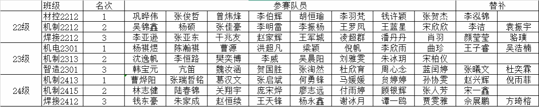 经过三轮激烈的比拼,最终机电2301班、机制2313班、智造2301班分获2023级前三名;材控2212班、机制2212班、焊接2212班分获2022级前三名。