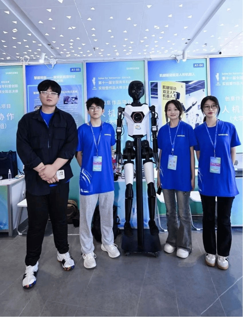 李晗、李艳阳、段梦莹、沈海瑞四名学生组成,涵盖机电技术教育、材料成型及控制工程专业。团队成员各司其职、密切协作,从机器人的运动控制算法开发、智能交互技术研发,到机械结构设计与材料选型优化,全方位推进作品创新,最终凭借扎实的专业功底和高效的团队配合,完成了兼具技术突破与应用价值的参赛项目。