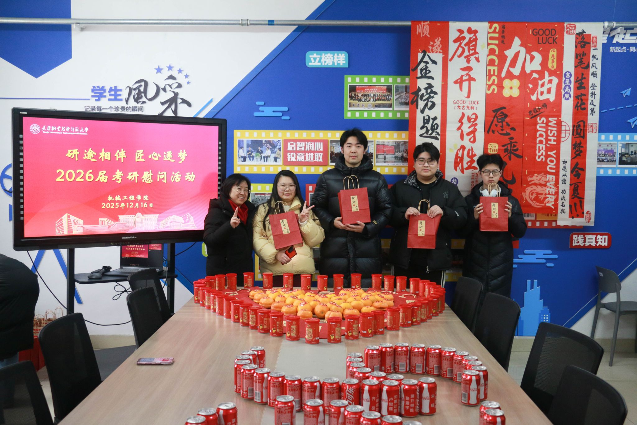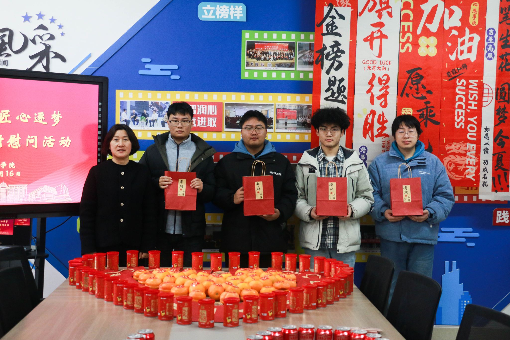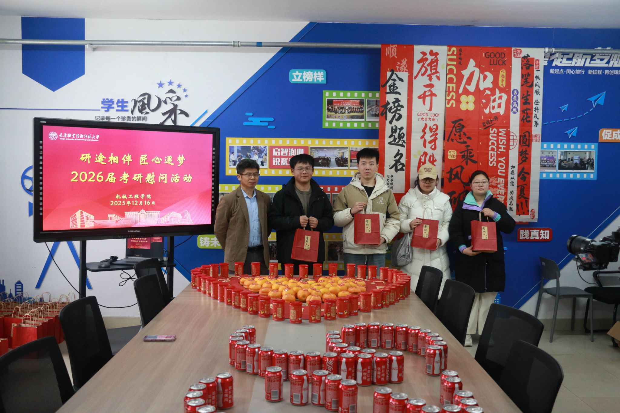 活动现场设置“能量补给站”,院领导亲手将定制化考研物资逐一发放至学生手中。这份精心筹备的“能量套餐”暗藏巧思:印有“一研为定”的可乐罐和标注“薯你最强”的薯愿桶寓意“乐见曙光”,为学子补充备考能量;金黄饱满的柿子和橙子寓意“心想事成”,寄托着对学子披荆斩棘的美好期许;而每张全体辅导员手写的祝福卡则承载着学院的殷切厚望,字里行间满是“研途必胜”的真挚鼓励。“可乐罐上的考研祝福语很贴心,老师们手写的‘保持节奏,稳扎稳打’更是让我倍感温暖与动力。”2026届机械设计制造及其自动化专业的袁同学手捧物资,难掩激动之情。