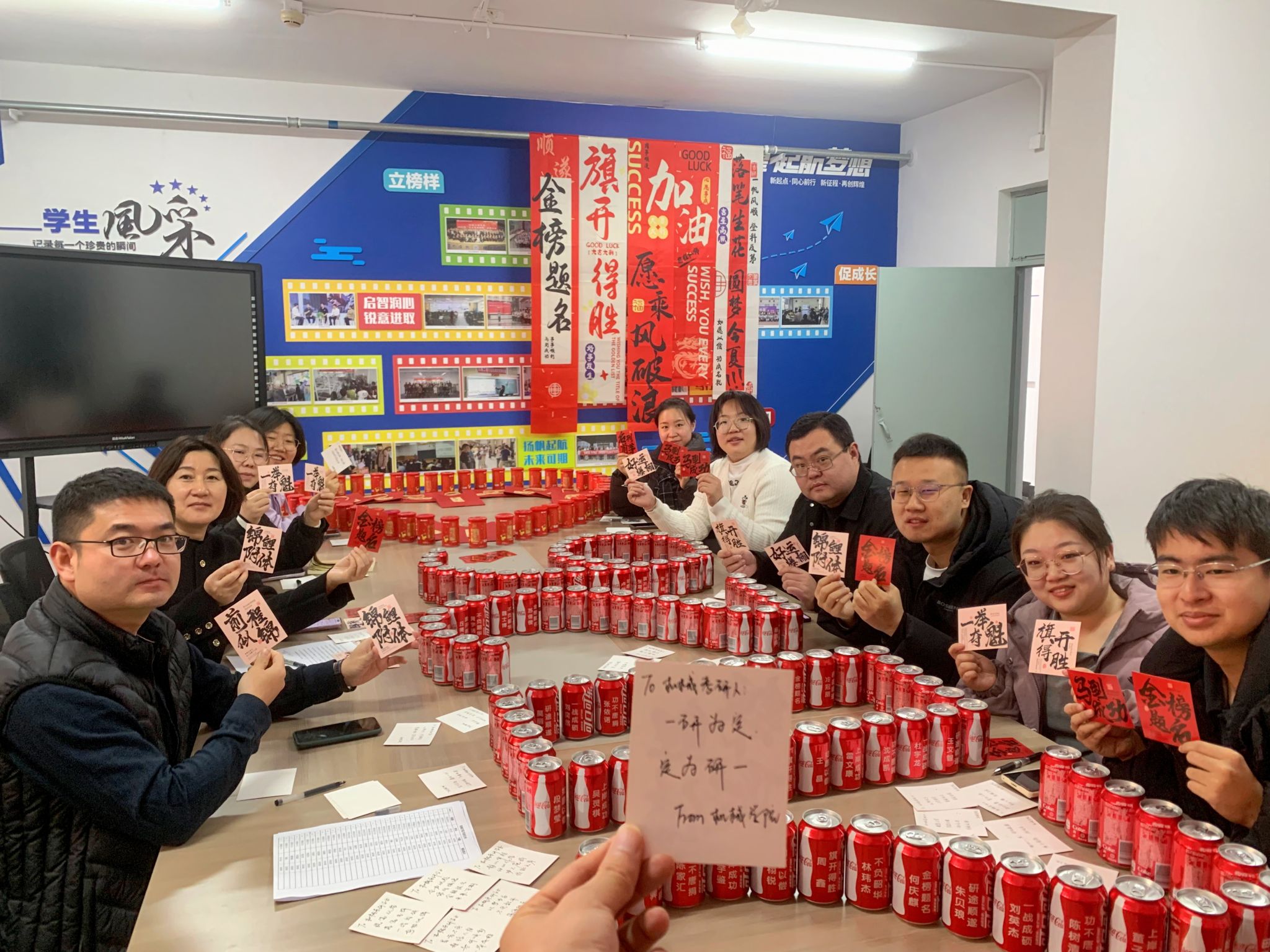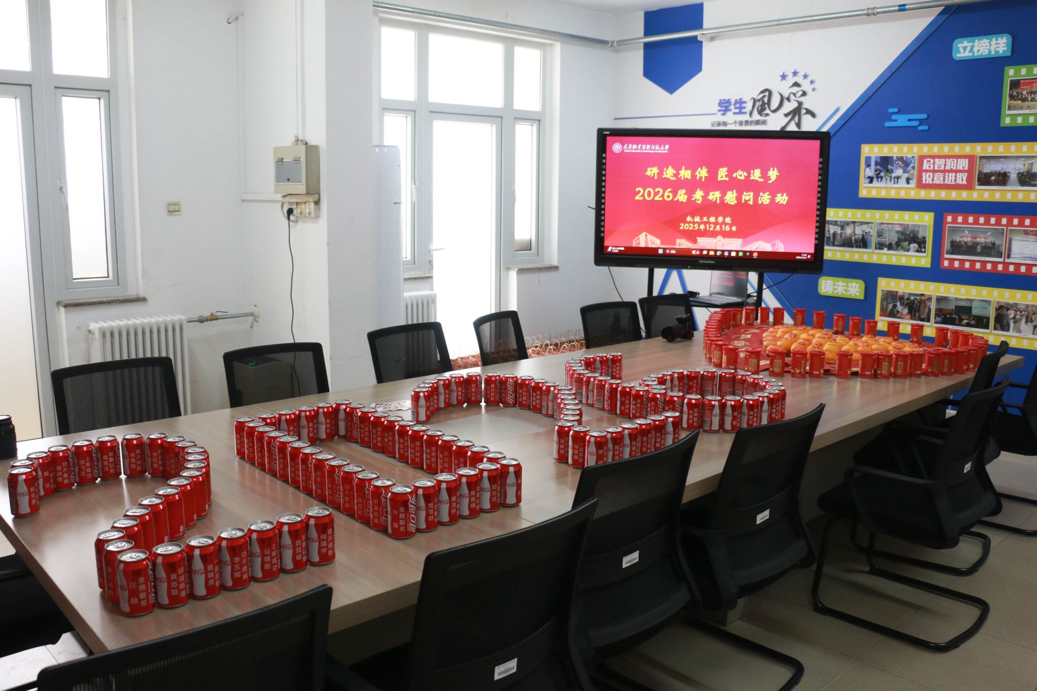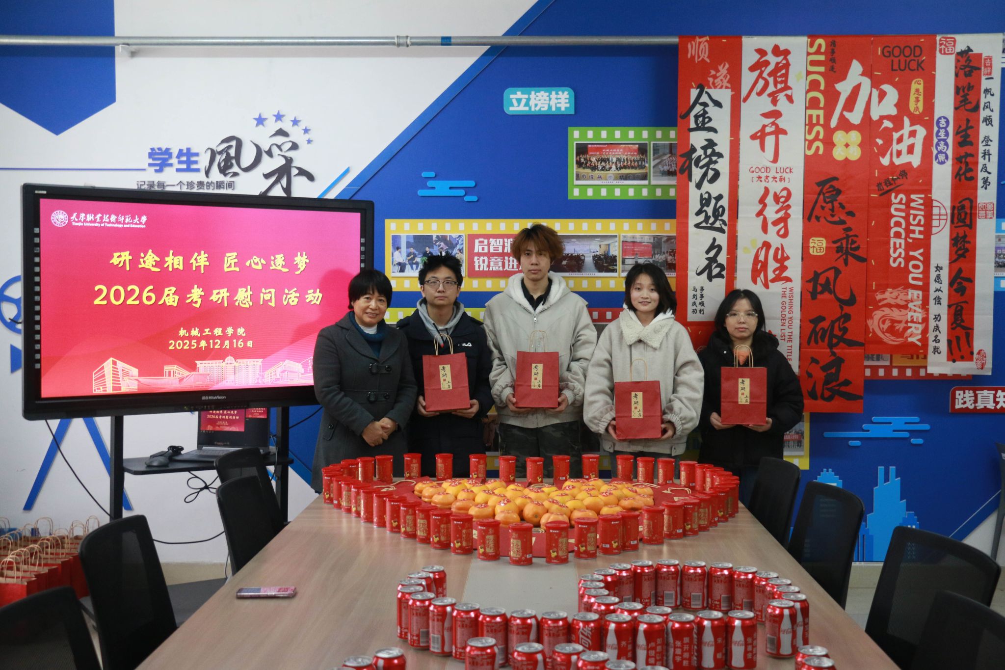 活动现场设置“能量补给站”,院领导亲手将定制化考研物资逐一发放至学生手中。这份精心筹备的“能量套餐”暗藏巧思:印有“一研为定”的可乐罐和标注“薯你最强”的薯愿桶寓意“乐见曙光”,为学子补充备考能量;金黄饱满的柿子和橙子寓意“心想事成”,寄托着对学子披荆斩棘的美好期许;而每张全体辅导员手写的祝福卡则承载着学院的殷切厚望,字里行间满是“研途必胜”的真挚鼓励。“可乐罐上的考研祝福语很贴心,老师们手写的‘保持节奏,稳扎稳打’更是让我倍感温暖与动力。”2026届机械设计制造及其自动化专业的袁同学手捧物资,难掩激动之情。
