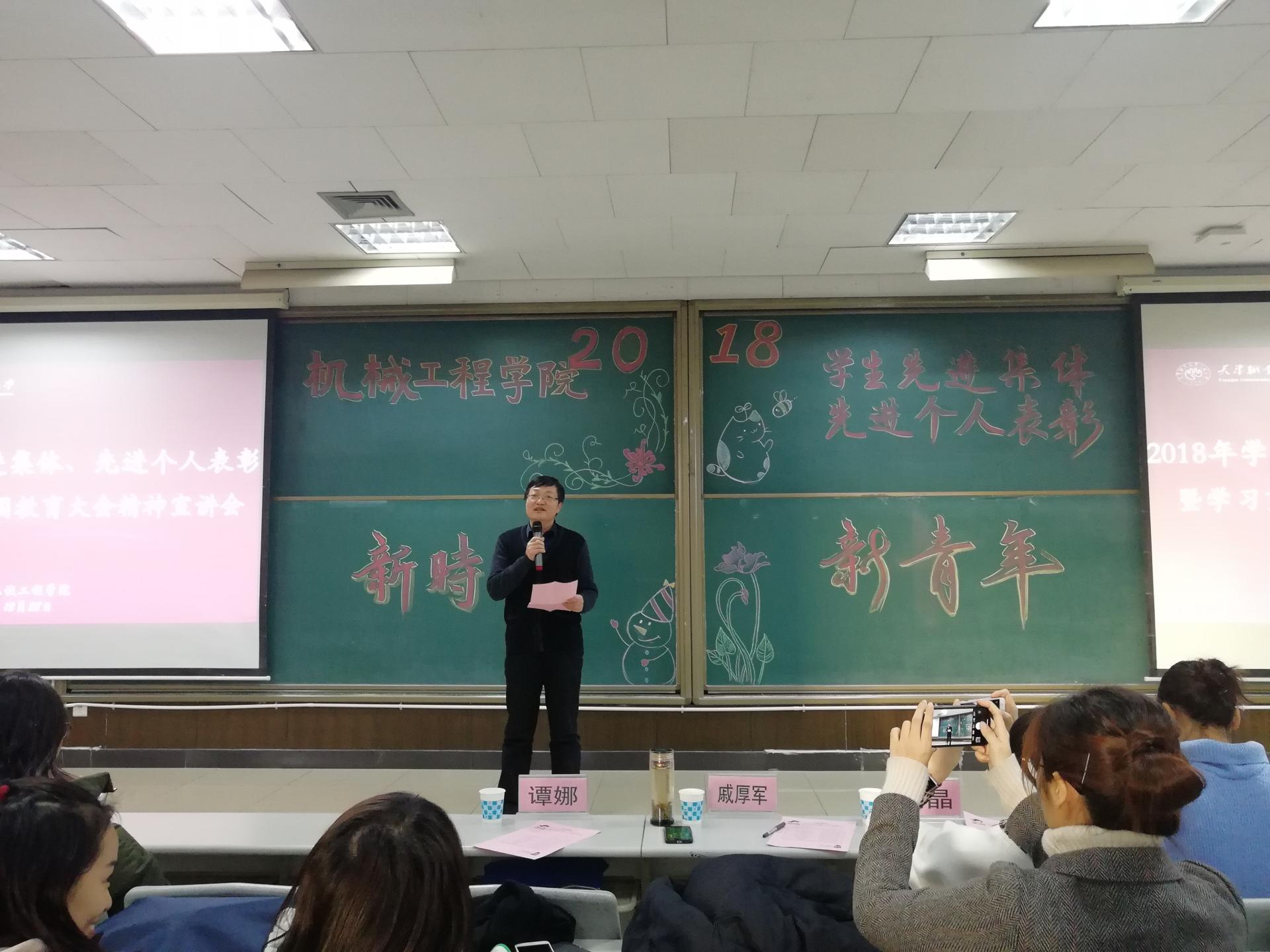 召开2018年度学生先进集体、先进个人表彰会暨学习贯彻全国教育大会精神宣讲会,学习贯彻落实全国教育大会精神,表彰表现突出的集体和个人。学院副院长戚厚军、院党委副书记刘晶出席会议,全体辅导员、教务科谭娜老师,先进集体代表、先进个人代表以及学生代表参加会议。会议由院团委书记戚霄主持。