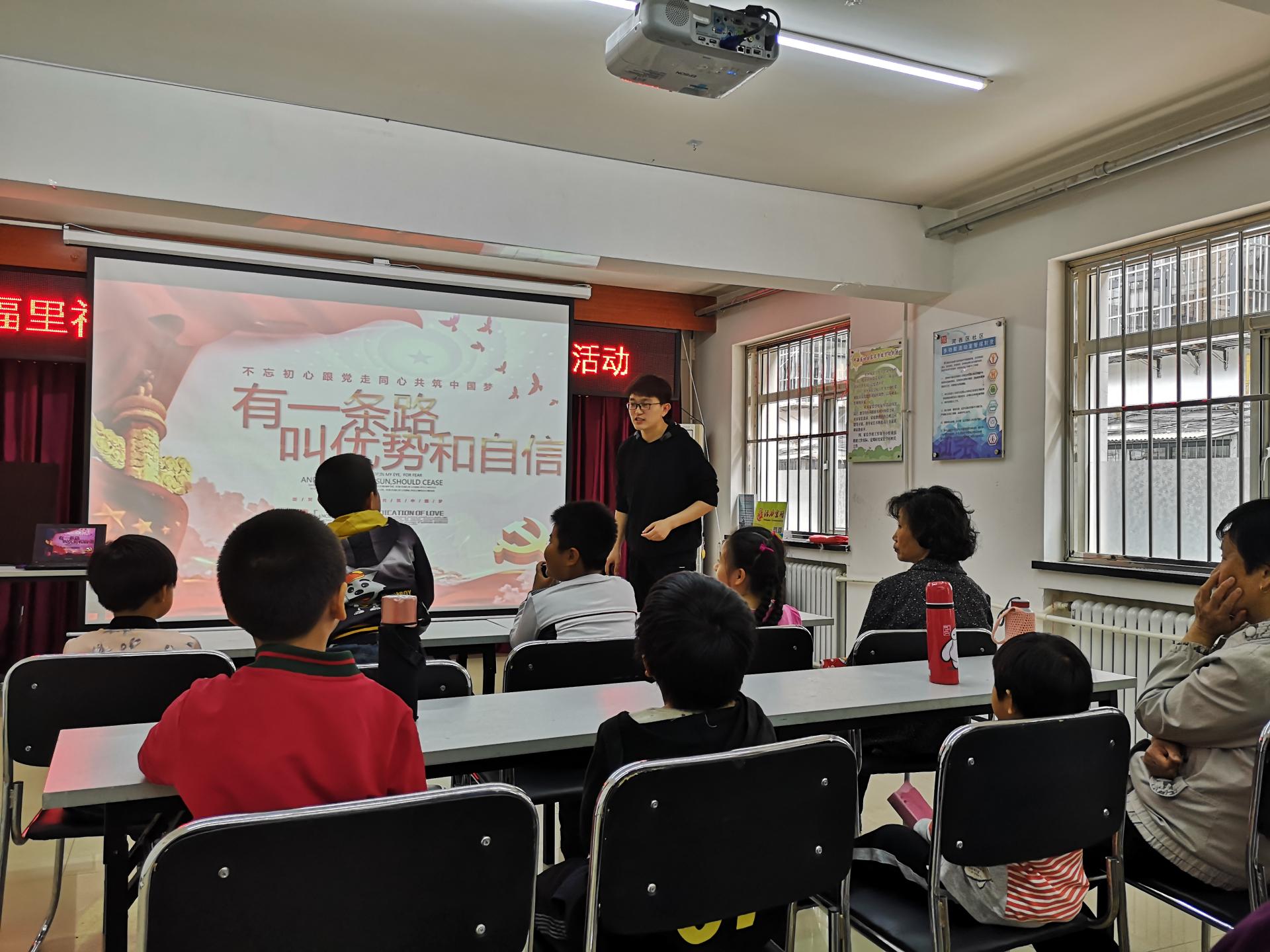 实践活动为社区小学生量身定制了通俗易懂、活泼生动的政治理论宣讲课,旨在打牢社会主义未来接班人和建设者的思想政治根基。学生党员陈国伟以小朋友们熟悉的动画片《熊出没》为切入点讲解“古今矛盾之新时代中国社会主义矛盾探究”,授课生动活泼、通俗易懂。学生党员贾永超以“有一条路叫优势和自信”为题,从小朋友们生活细节处入手,以小见大,讲述了坚持党的领导、人民当家作主、依法治国有机统一。